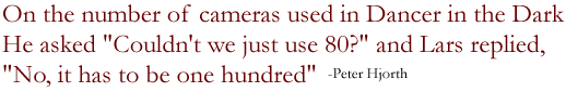 Broderick: I had a funny conversation with Peter AalbÊk Jensen [head of Zentropa which produced Dancer In the Dark] about the one hundred cameras. He asked Lars "Couldn't we just use 80?" and Lars replied, "No, it has to be one hundred".